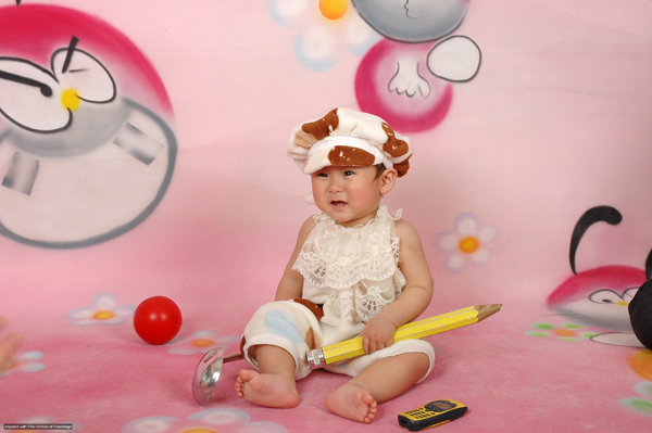 委屈啊,今天我是寿星,你们把我弄到这么个地方来折腾啥啊……我不玩了!笑笑的周岁照,上一张表情特别的……小家伙那是相当的不高兴,早上5点多就起来了,到拍完照片11点,一直没睡觉,实在受不了了,哭了……换下衣服趴在爸爸肩上就睡着了。