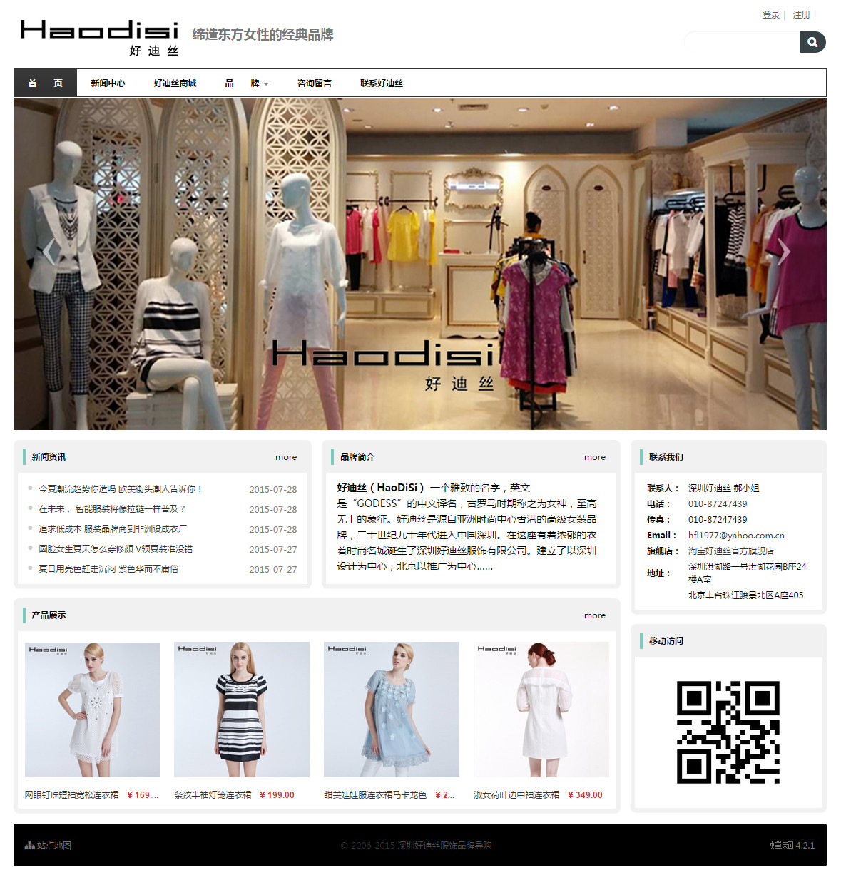 2、 好迪丝服饰品牌导购 这个站是当时看中了 haodis.com 这个域名,觉得比较好听,就注下来了,后来发现有这么一个叫好迪丝的品牌女装,而且居然没有官方网站,只在淘宝上有个淘宝的旗舰店。后来考察了下,发现这个品牌女装的服装质量还不错,价格属于适中的,还有专门的服装模特儿,可惜的是宣传做得不好。索性就以这个品牌做了个品牌形象站,把这个品牌的品牌故事、品牌历史、品牌新闻、品牌加盟信息都汇拢起来。谈品牌站业务的时候可以给其他客户看看,里面的产品都是直接链接到这个品牌的淘宝官网,质量也有保证。现在这个站的品牌名称百度排名已经在第一页很长时间了,效果是看得见的。